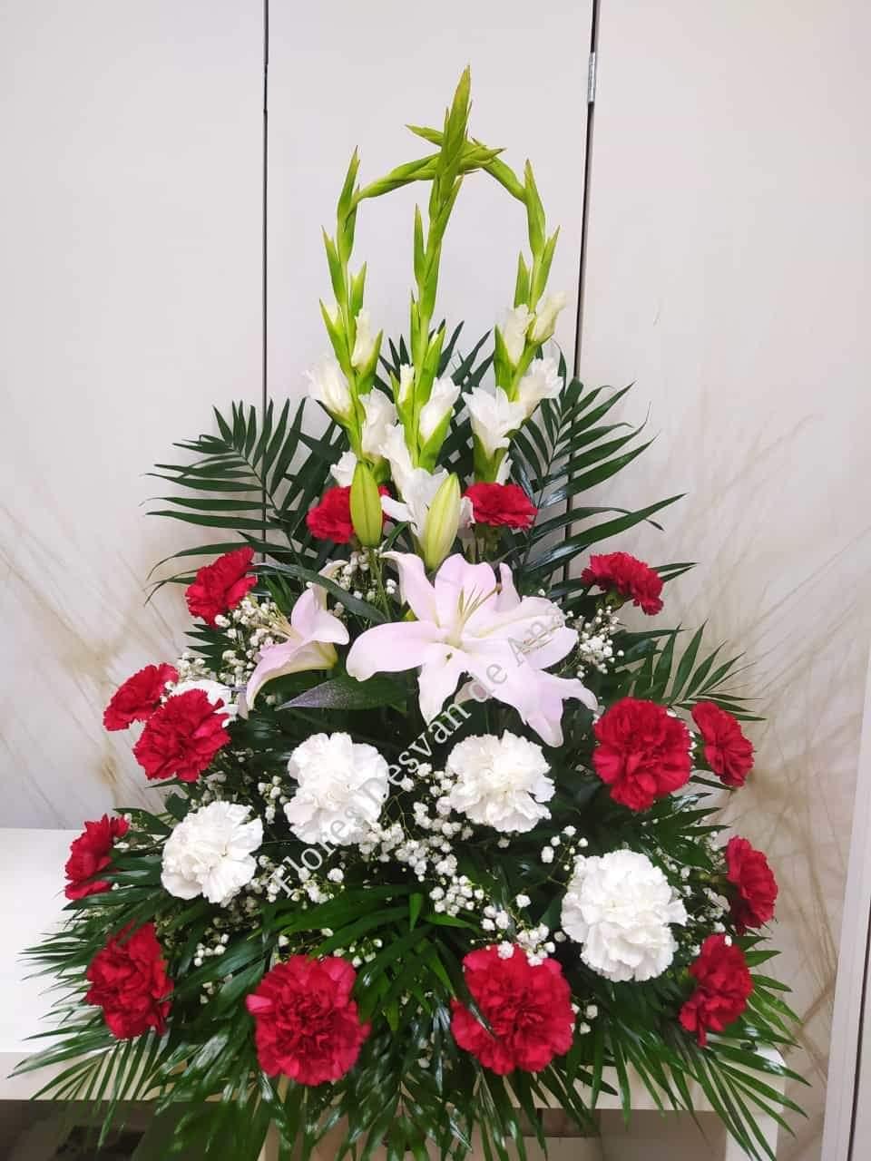 Centro con 3 gladiolos, 20 claveles, paniculata y lilium.