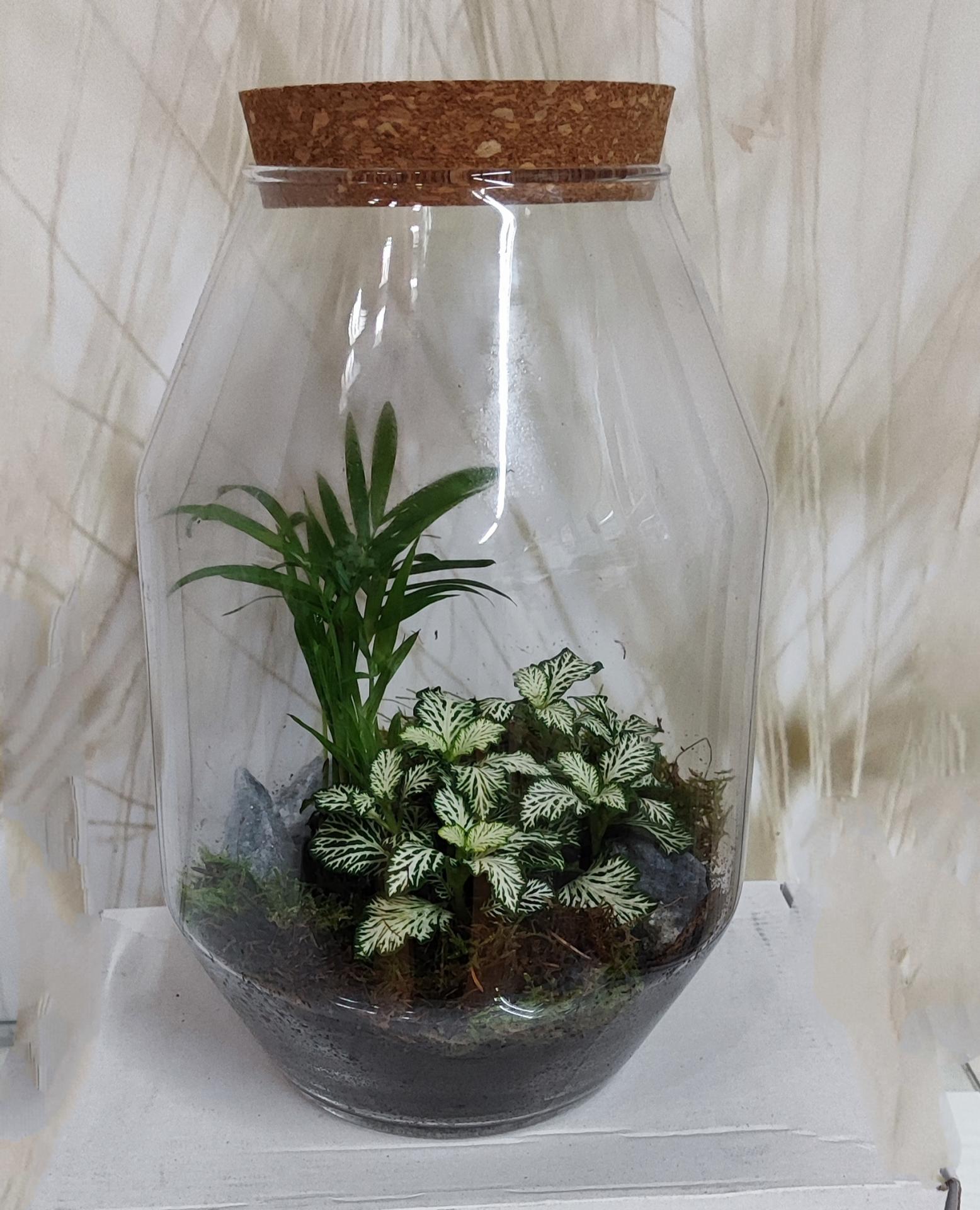 Terrario bosque , es un mini ecosistema autosuficiente dentro de un recipiente de vidrio. Si se empaña demasiado,se debe destapar.