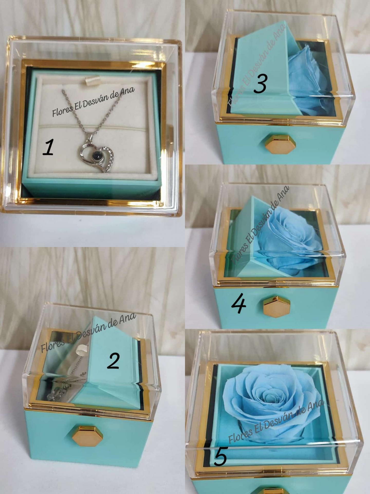 TURQUESA es una cajita que e puede girar 360°.Un lado es una rosa que "nunca se marchita", en el otro lado es un regalo de amor y sorpresa.❤️