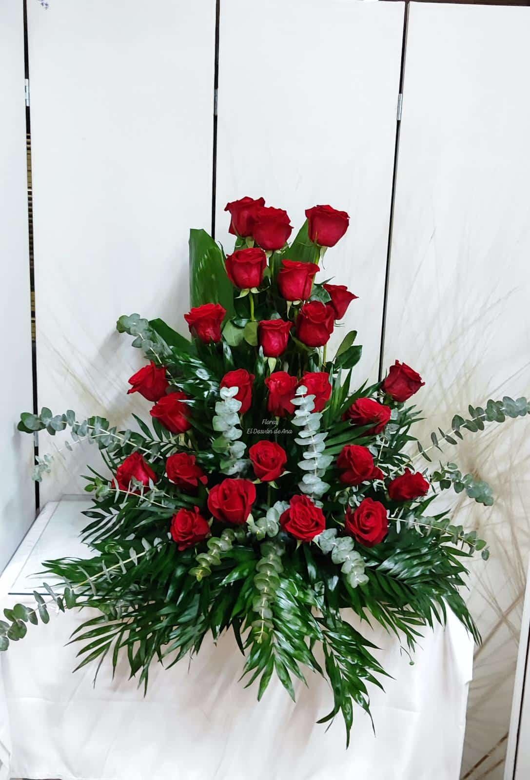 Espectacular centro de rosas rojas extras, altura 70 cm. aprox.. Los verdes pueden variar según disponibilidad
